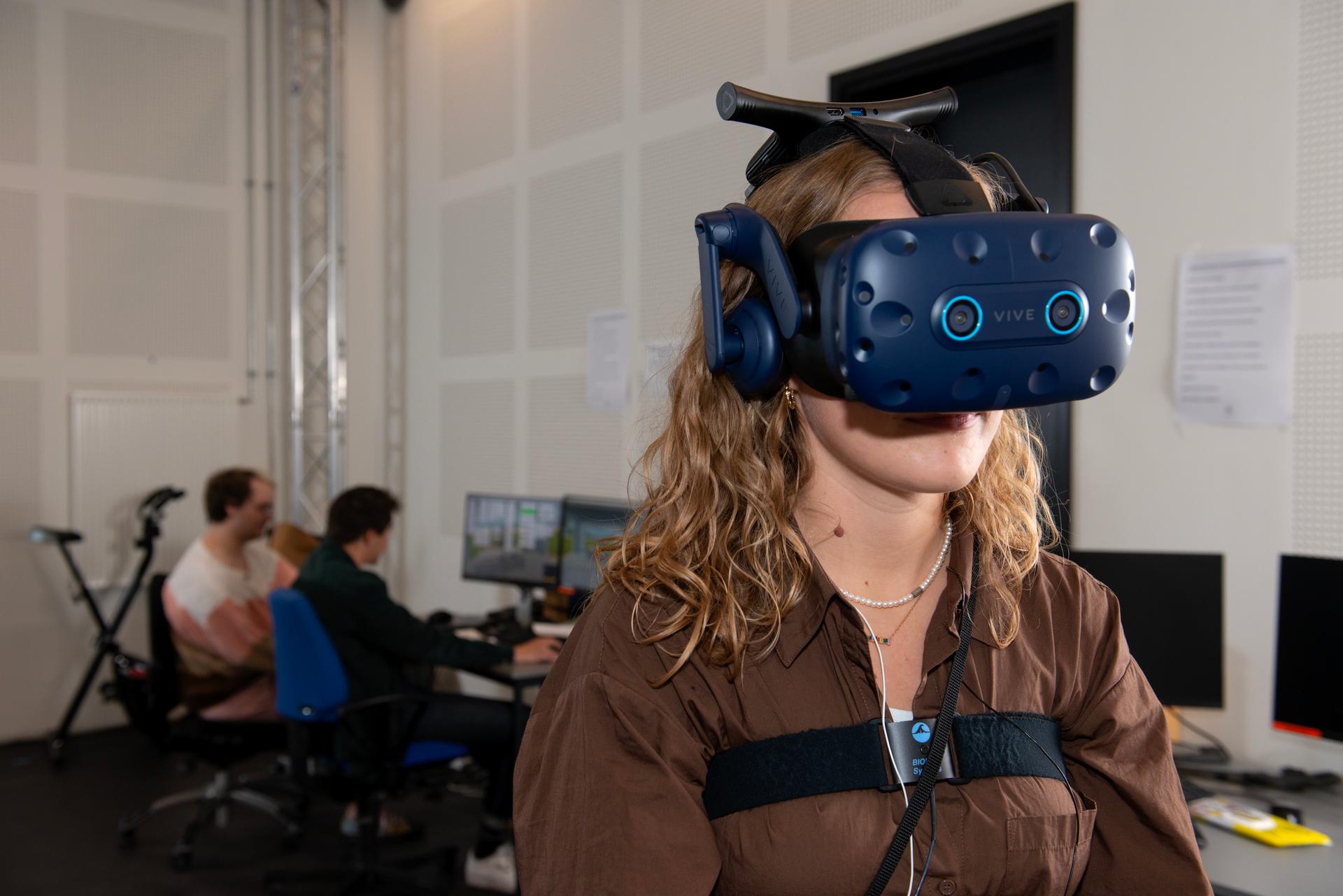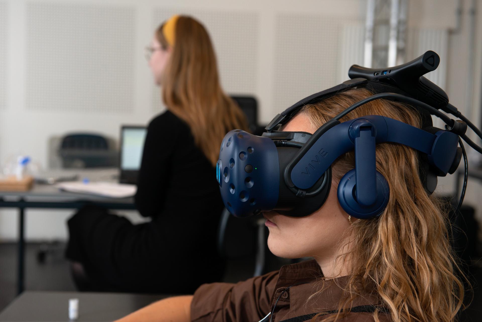 A windowless lab equipped with three desktop PCs with NVIDIA GeForce graphics cards, three HTC Vives (two with a wireless adapter, the one on the right with a pupil labs eye tracker add-on), and a VirZoom bike.