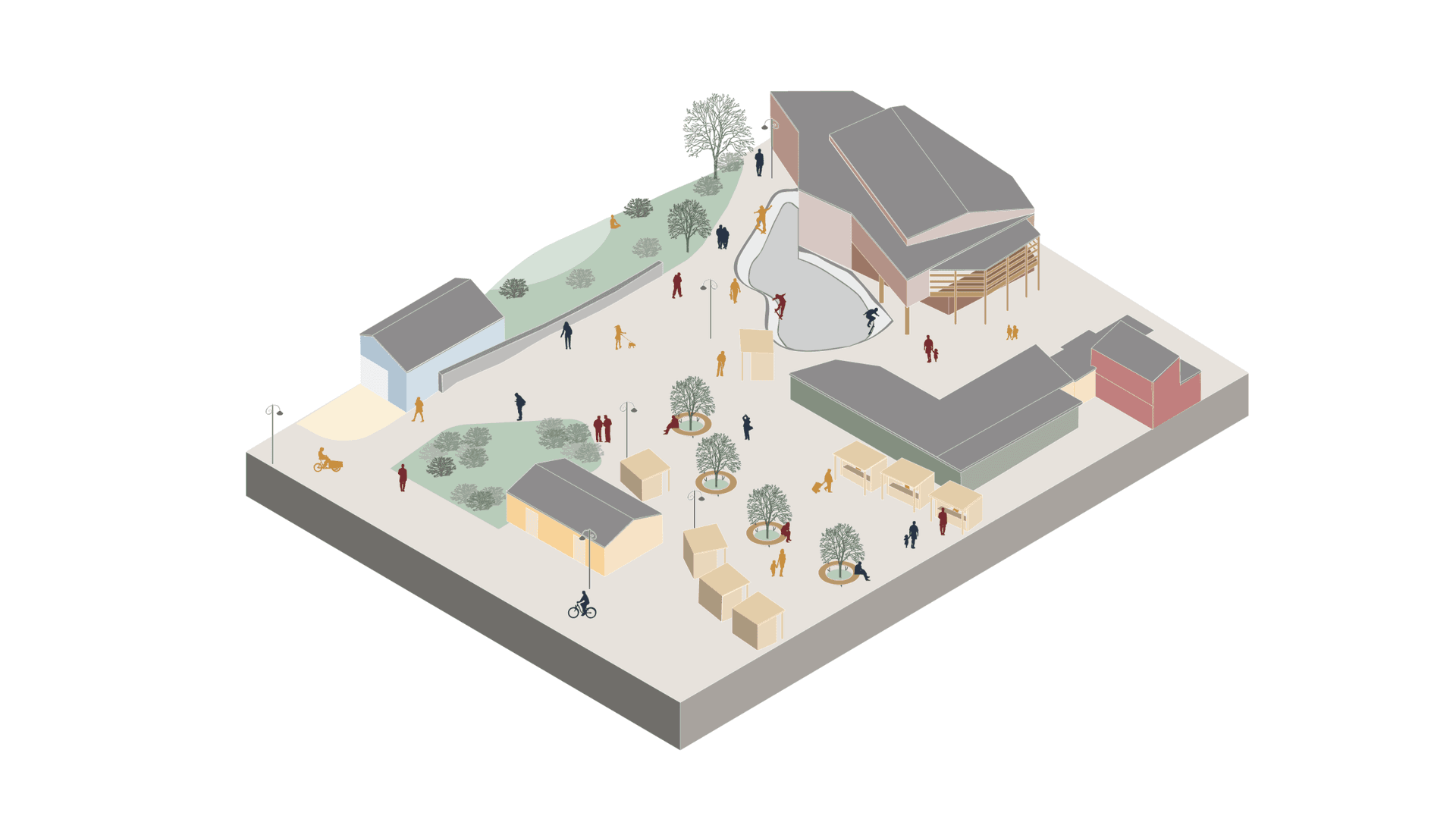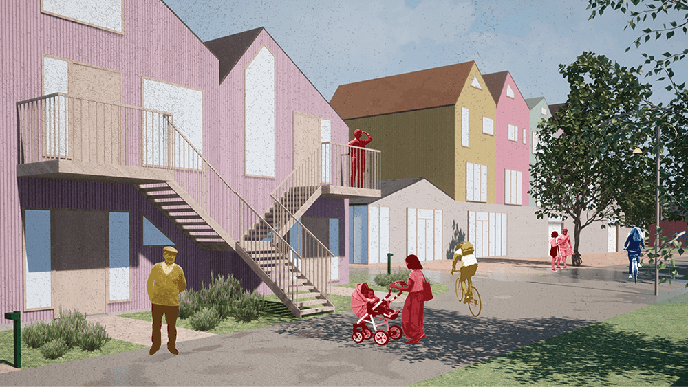 The design process considers the concept of boundaries utilizing mixed-use buildings, integrating housing with common facilities and other businesses, while preserving Christiania's identity.