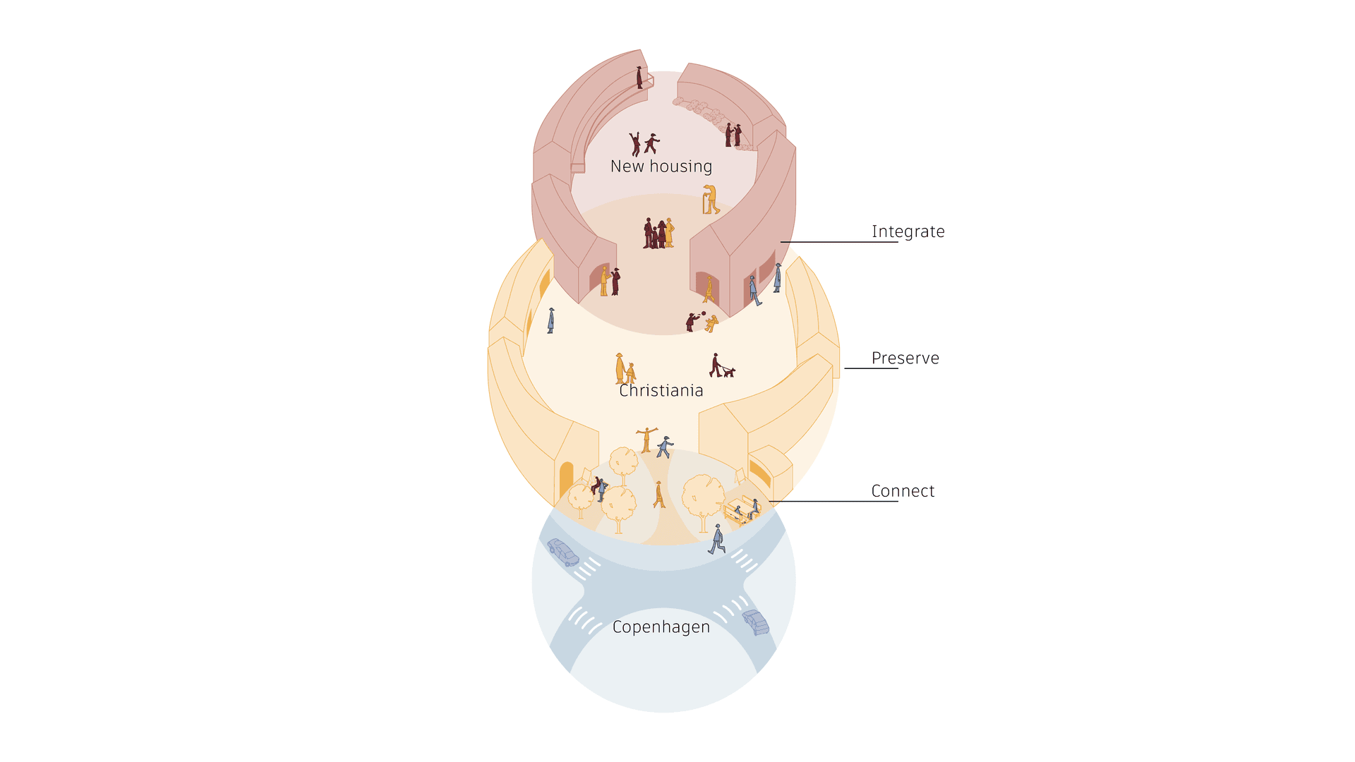 Overall, this proposal contributes to connecting Copenhagen while integrating newcomers and preserve the identity of Christiania with a holistic approach that not only focuses on social housing but also on the distinct lifestyle and values of the community.