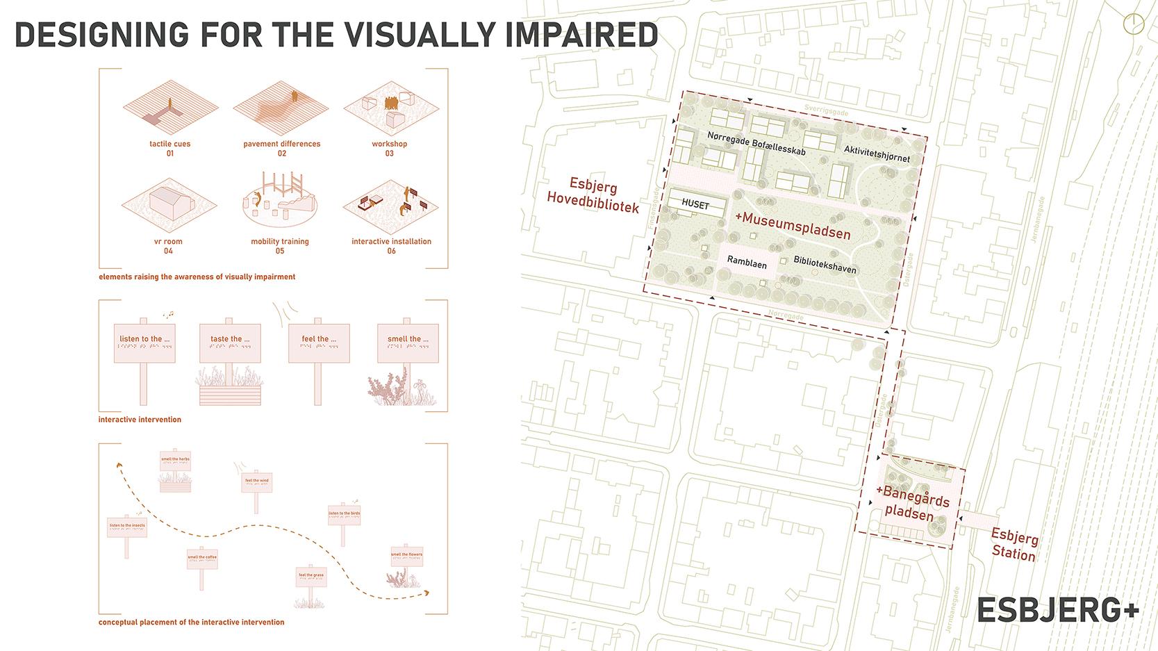 This master's thesis, "Designing for the visually impaired", presents Esbjerg+, a transformative project in Esbjerg's city centre. Named for its focus on inclusivity from the outset, Esbjerg+ includes Banegårdspladsen and Museumspladsen, aiming to attract a diverse range of people.