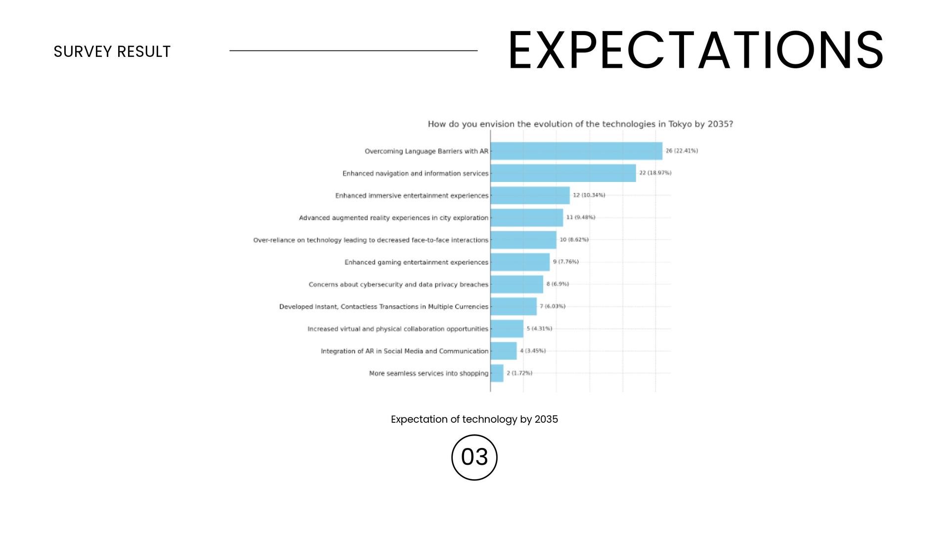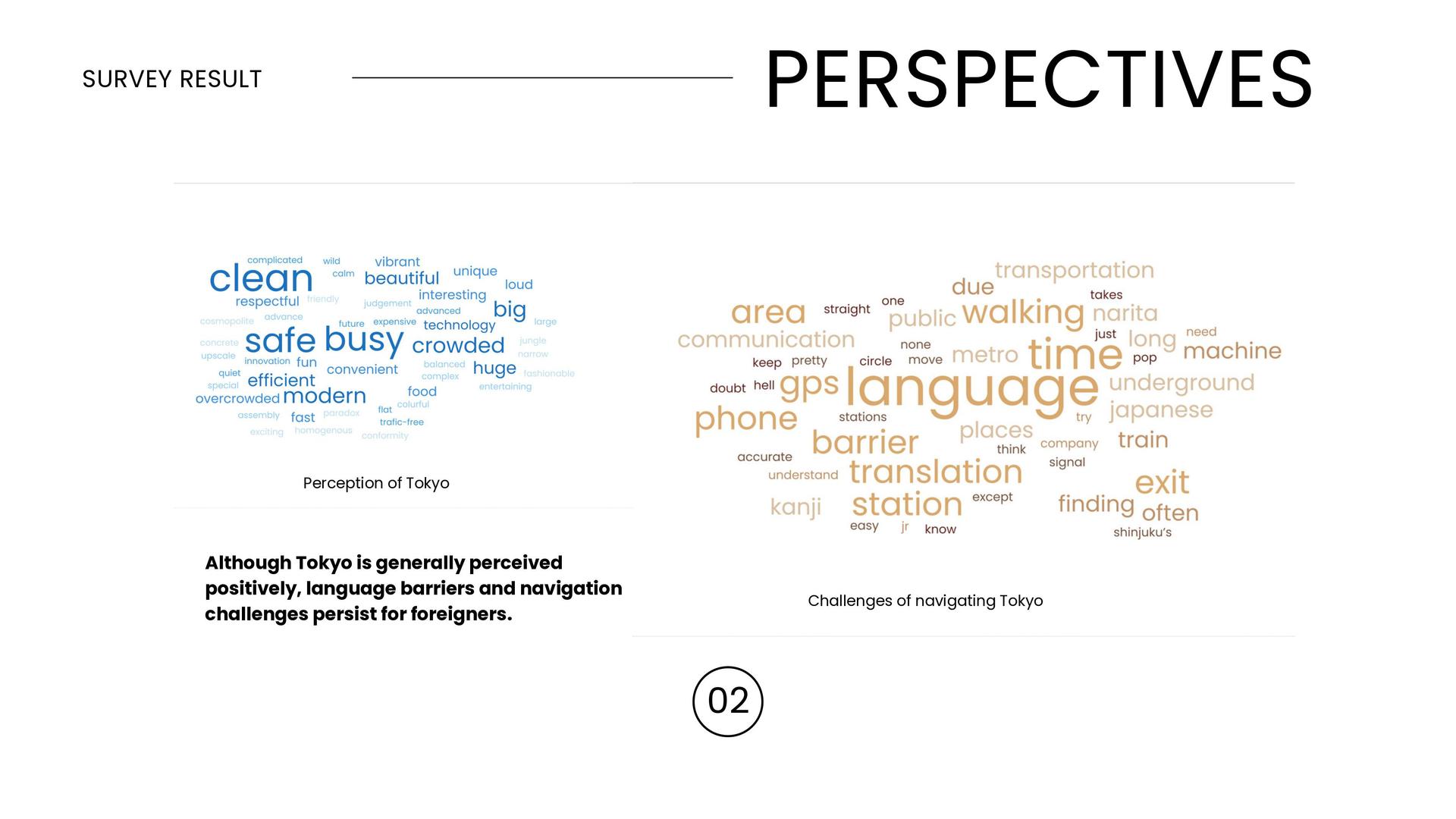 Undersøgelsen viser, at smartphones i øjeblikket er uundværlige for navigation og sprogoversættelse for udenlandske besøgende. Tokyo opfattes som ren og sikker, men også som meget overfyldt med vanskeligheder ved at navigere i komplekse transportsystemer for ikke-japansktalende. Med blik mod fremtiden er der en forventning om teknologier, der især forbedrer navigation og kommunikationsengagement. I en bymæssig kontekst, for Tokyo i 2035, ses "Livable City"-scenariet som den mest ønskværdige fremtid på grund af dets gennemførlighed og opfattelsen af det japanske bylandskab med et højt transit-orienteret bysystem og tilstrækkelige grønne områder.