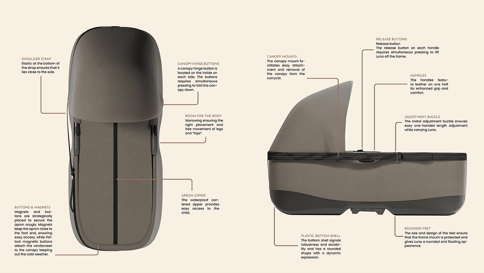 Key features of the proposed carrycot, Luna, include an adjustable shoulder strap, ergonomic design, and materials suitable for indoor and outdoor use. These features address the parents’ needs for practicality, comfort, and durability, reducing reliance on multiple add-on products and re-establishing a strong product-user fit.