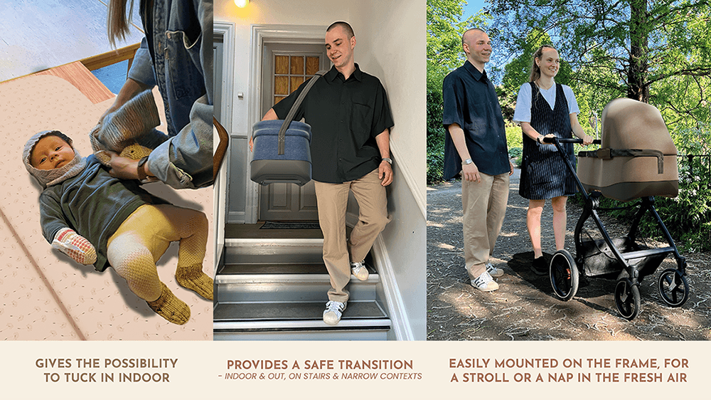 This project explores the development of a versatile carrycot designed for both indoor and outdoor use, aiming to simplify the daily routines of first-time parents and enhance their babies’ sleep quality. Grounded in user research and insights from Odder Barnevognsfabrik, the project identifies the critical need for a seamless transition between indoor and outdoor environments for babies’ daytime naps.