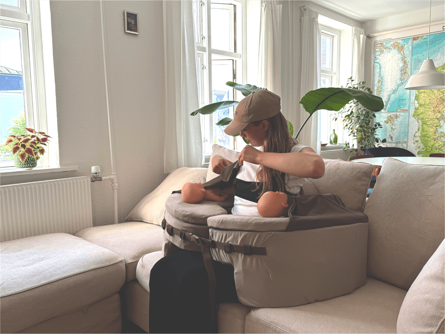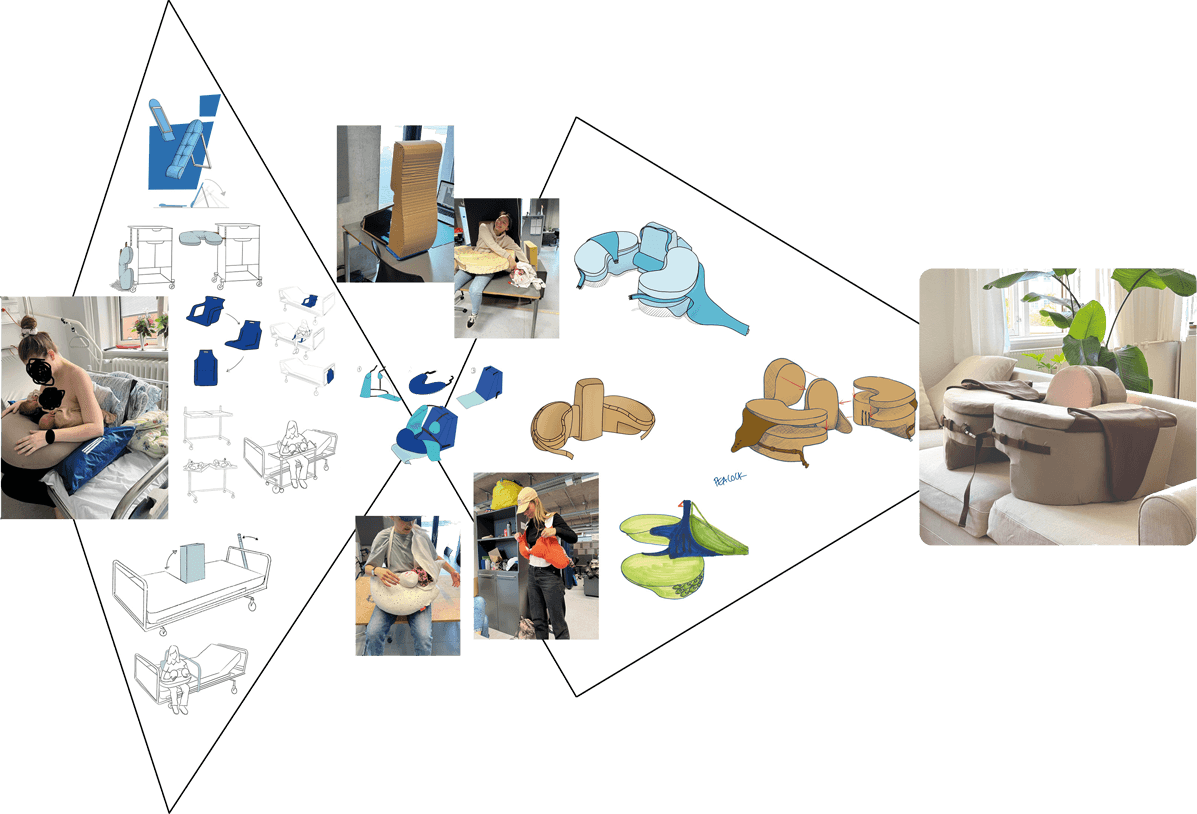 A product proposal has therefore been designed to allow the mother to tandem breastfeed without the need of assistance at the hospital as well as at the home. This will improve both the mother´s and nurse´s workload, optimizing their time and bring a sense of serenity into a chaotic situation. Through research and interviews with both nurses and twin mothers, the needs and requirements of these user groups have been understood. This information has been used to generate sketches, concepts, mock ups and CAD-models which have been tested on the user groups to evaluate and provide feedback on the functions, interactions and perception of the concept. The product proposal has resulted in a semi-furniture that consists of a backrest with an adjustable back piece attached to two side pieces intended to hold the babies by securing them with an incorporated swaddle. A wedge on each side piece makes it possible to adjust these according to the size of the mothers upper body. Each part is upholstered and can be separated when cleaning the product by removing the cover and throwing it in the washing machine.