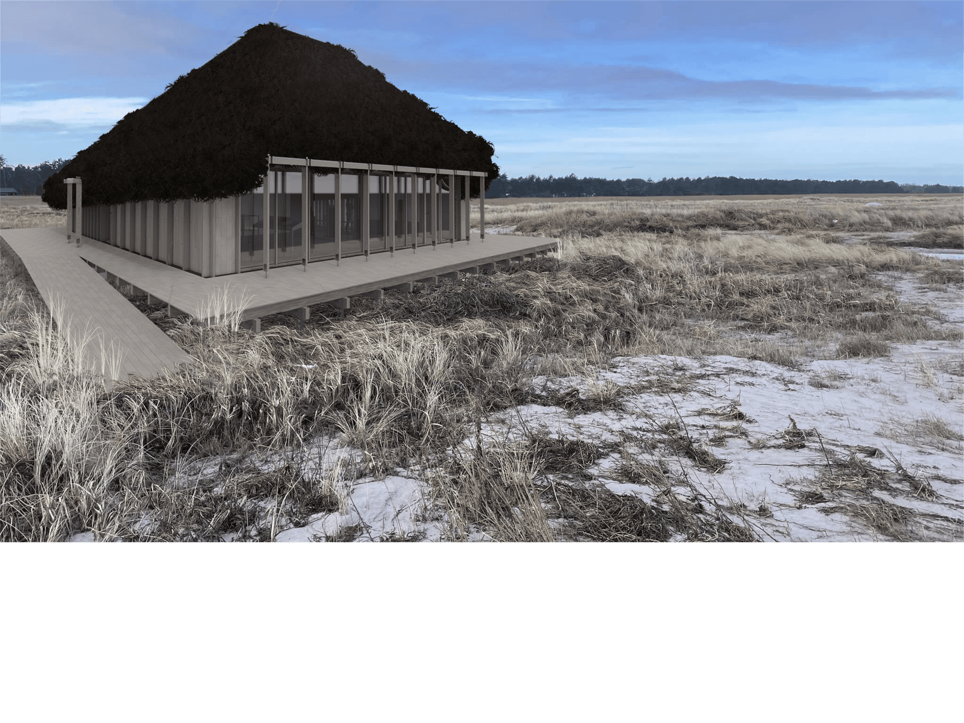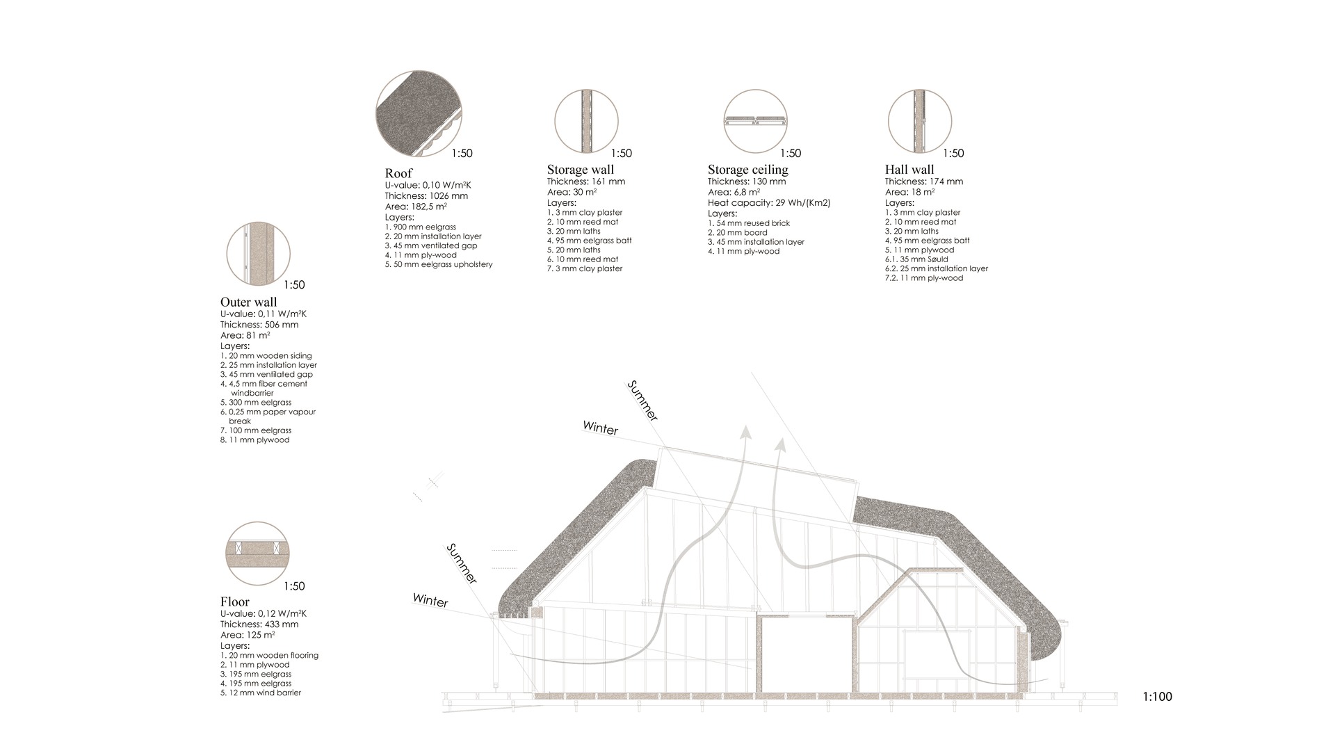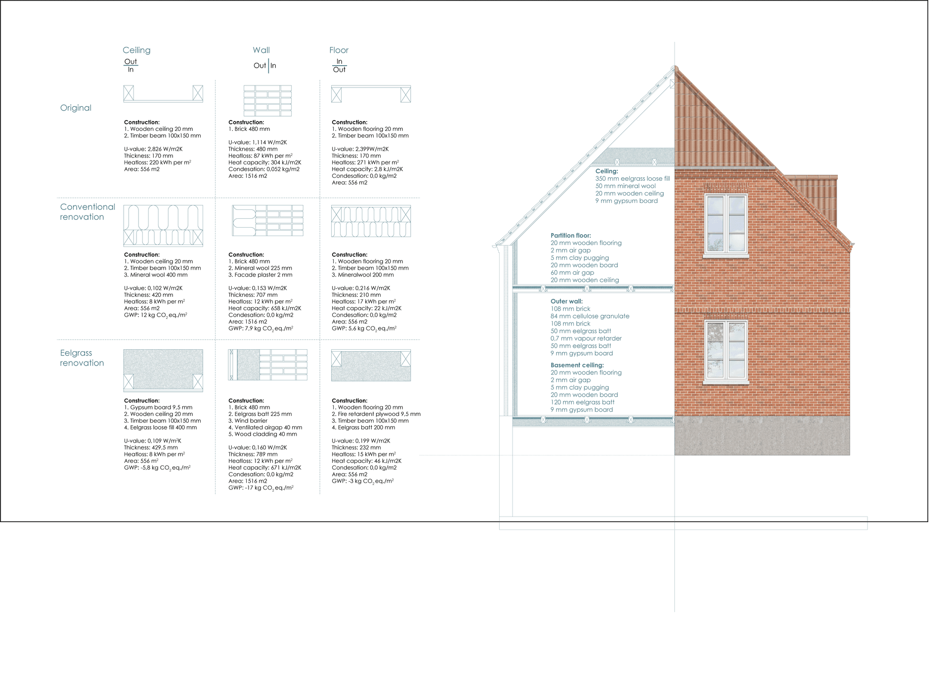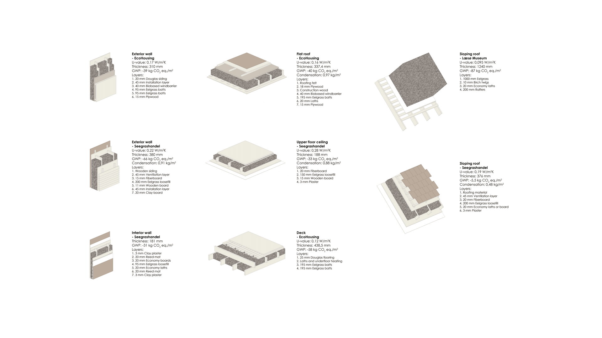 The thesis showcases eelgrass applications in both renovations and new constructions, including a small exhibition building designed to raise awareness of eelgrass. Findings reveal that eelgrass has properties comparable to, or better than, existing biobased and mineral materials, excelling in thermal and acoustic insulation with a low Global Warming Potential.