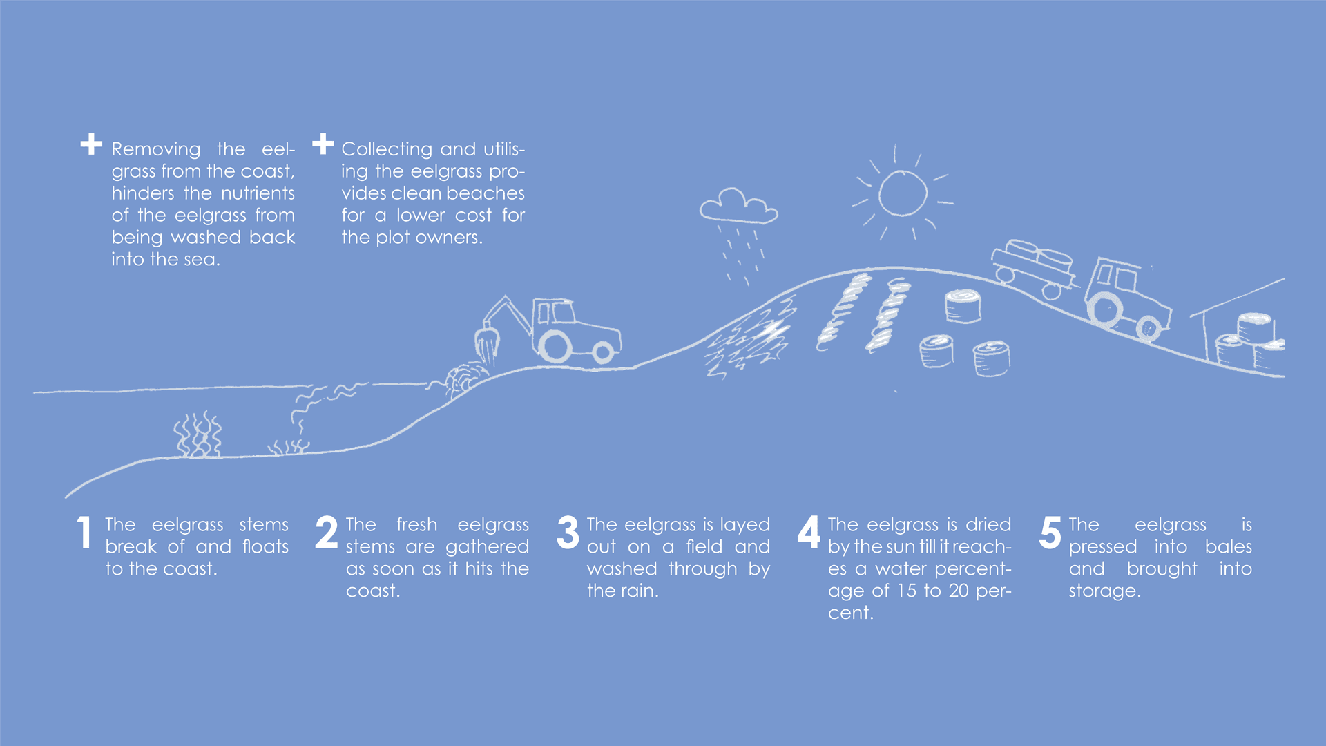Afhandlingen viser anvendelser af ålegræs i både renoveringer og nybyggeri, herunder en lille udstillingsbygning designet til at øge bevidstheden om ålegræs. Resultaterne viser, at ålegræs har egenskaber, der kan måle sig med eller overgå eksisterende biobaserede og mineralske materialer, især inden for termisk og akustisk isolering og med lavt globalt opvarmningspotentiale.