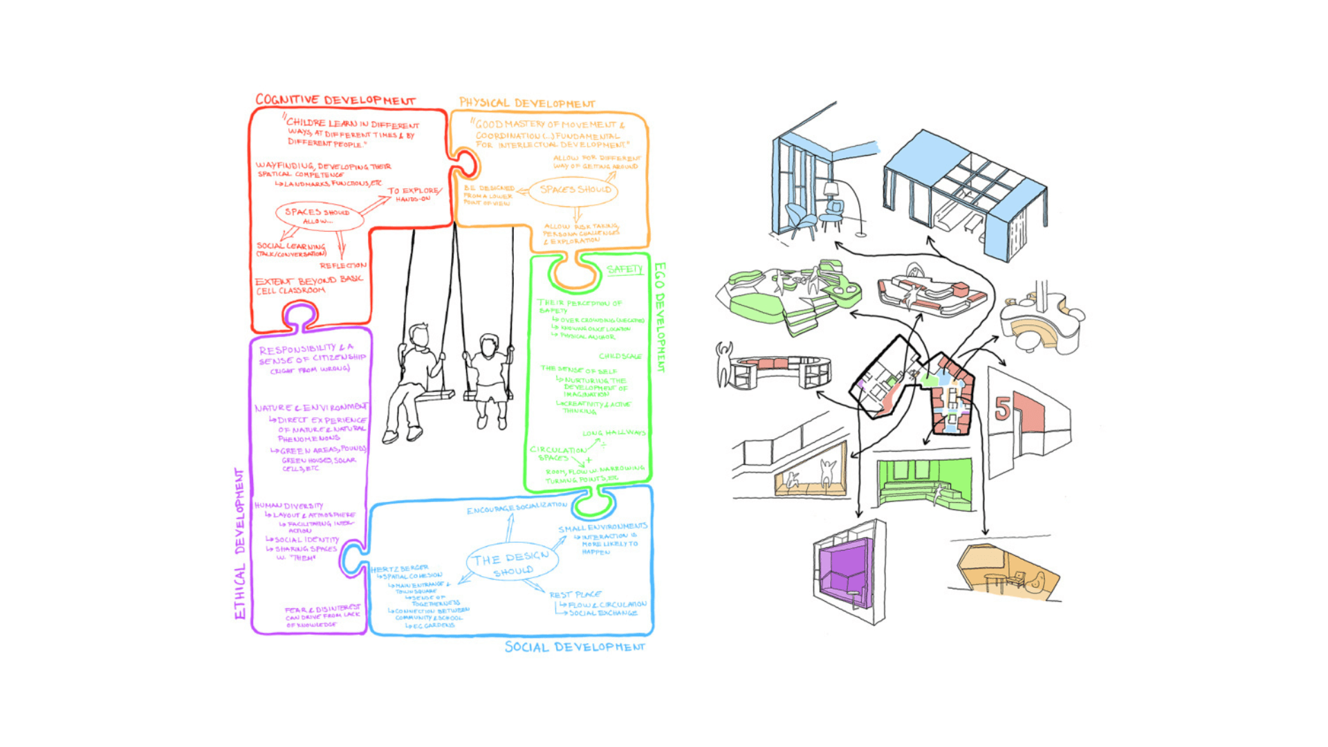 Gennem en observationsanalyse af Horsens Statsfængsel og Randers Statsskole blev der identificeret flere aspekter med både arkitektoniske og psykologiske karakteristika. Disse aspekter kulminerer i en liste over designkriterier, som støtter en mere informeret beslutningsproces. Disse indsigter danner grundlag for udformningen af den nye Stigsborg Skole, gennem en integreret designmetode – der kombinerer arkitektonisk praksis med menneskecentreret forskning. Der lægges vægt på børns udviklingsbehov, indeklima og sansemæssig stimulering, med målet om at omsætte teoretiske fund til rumlige strategier, der understøtter autonomi, nysgerrighed og trivsel.