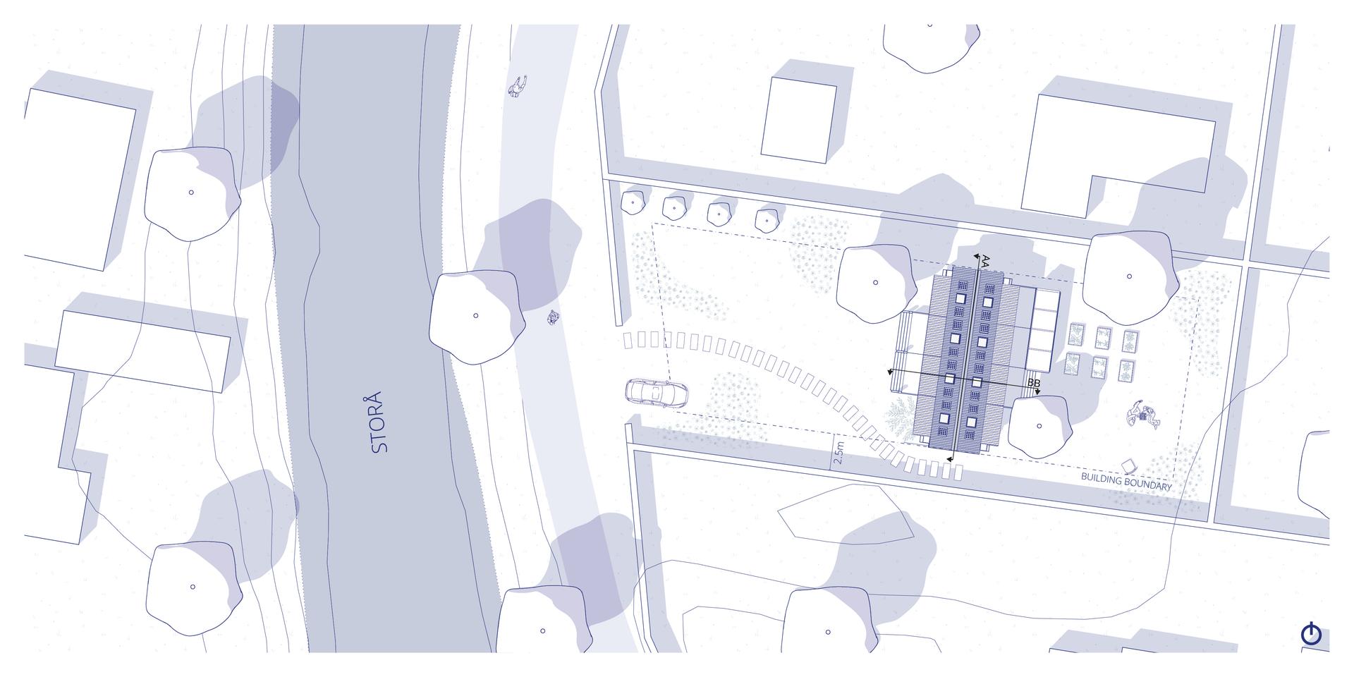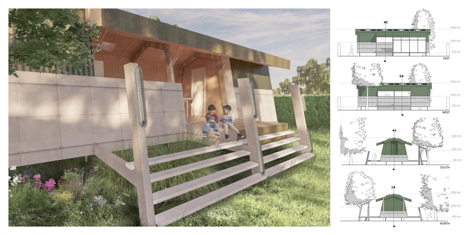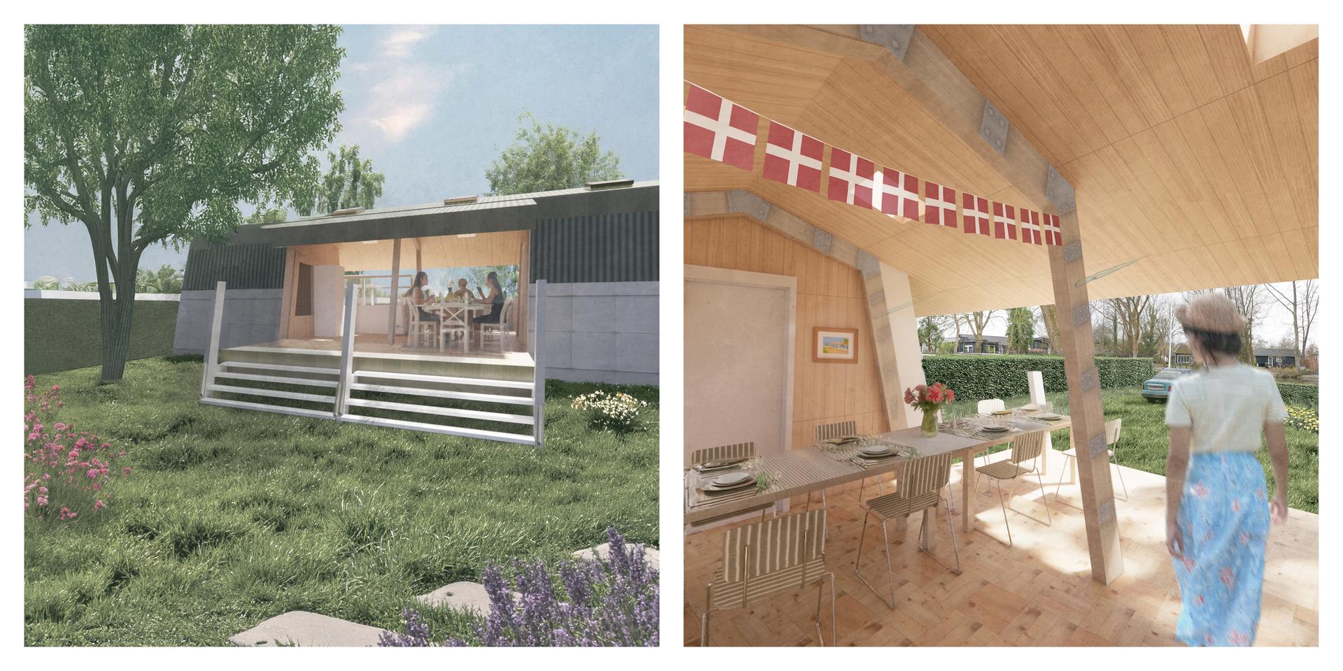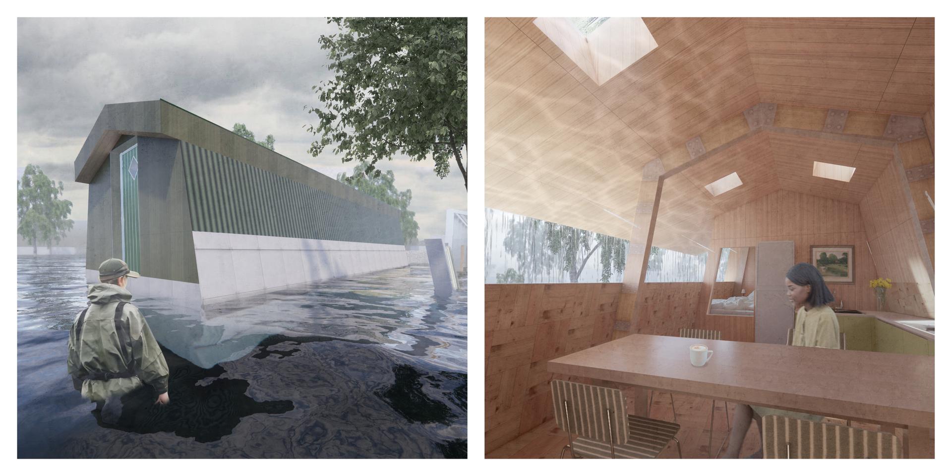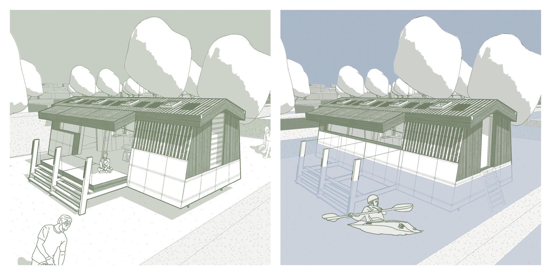 The design is guided by three key focuses: flood resilience, flood experience, and extending material lifetime. The structure is elevated to withstand shallow floods and equipped with a watertight facade system capable of resisting up to 1.5 meters of water. The architecture responds to seasonal change by opening fully in dry, warm weather to dissolve the boundary between house and garden. In contrast, during storms or flooding, the building transforms into a secure refuge, with closed walls and a carefully designed interior atmosphere that embraces water through light, reflection, and sound. Materials from the original building are repurposed based on their physical properties, with all components designed for disassembly, maintenance, and eventual replacement using biobased or recycled alternatives.