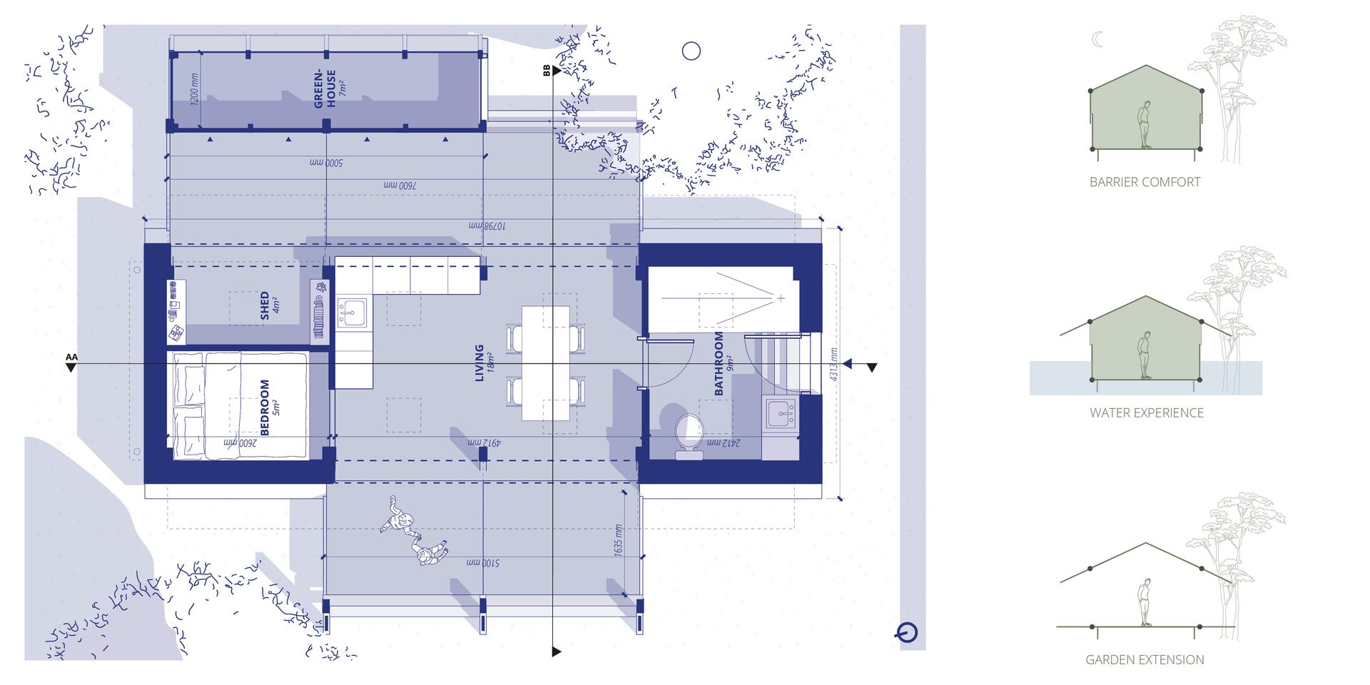 Designet tager afsæt i tre hovedfokusområder: oversvømmelsesrobusthed, oplevelse af oversvømmelse og forlængelse af materialernes levetid. Bygningen hæves for at kunne modstå lavvandede oversvømmelser og har et vandtæt facadesystem, der kan modstå op til 1,5 meter vand. Arkitekturen reagerer på årstidernes skiften ved at kunne åbne sig helt i tørt, varmt vejr og opløse grænsen mellem hus og have. I kontrast hertil forvandles bygningen under storm eller oversvømmelse til et sikkert tilflugtssted med lukkede vægge og et nøje designet indre, der gennem lys, refleksion og lyd integrerer vandet i oplevelsen. Materialer fra den oprindelige bygning genanvendes ud fra deres fysiske egenskaber, og alle komponenter er designet til demontering, vedligeholdelse og på sigt udskiftning med biobaserede eller genbrugte alternativer.