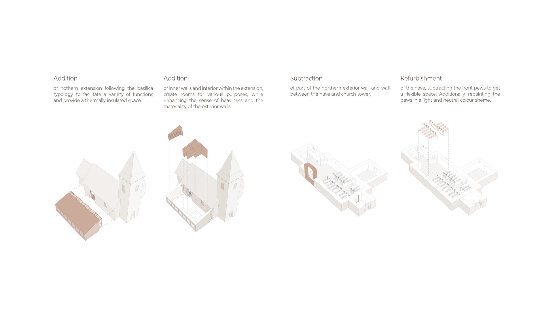 Through a thorough architectural and cultural analysis of the Danish medieval church’s history and the building typology, the basilica, a framework for the possibilities of adaptations to medieval village churches are developed. This is created based on the methodology of Rob Roggema’s Research by Design, and sub methods Framework for the Field of Opportunities in relation to the medieval village church by Maj Bjerre Dalsgaard, Søren Vadstrup’s Analysis and Value Assessment of Buildings, and Johannes Exner’s Four Keys.