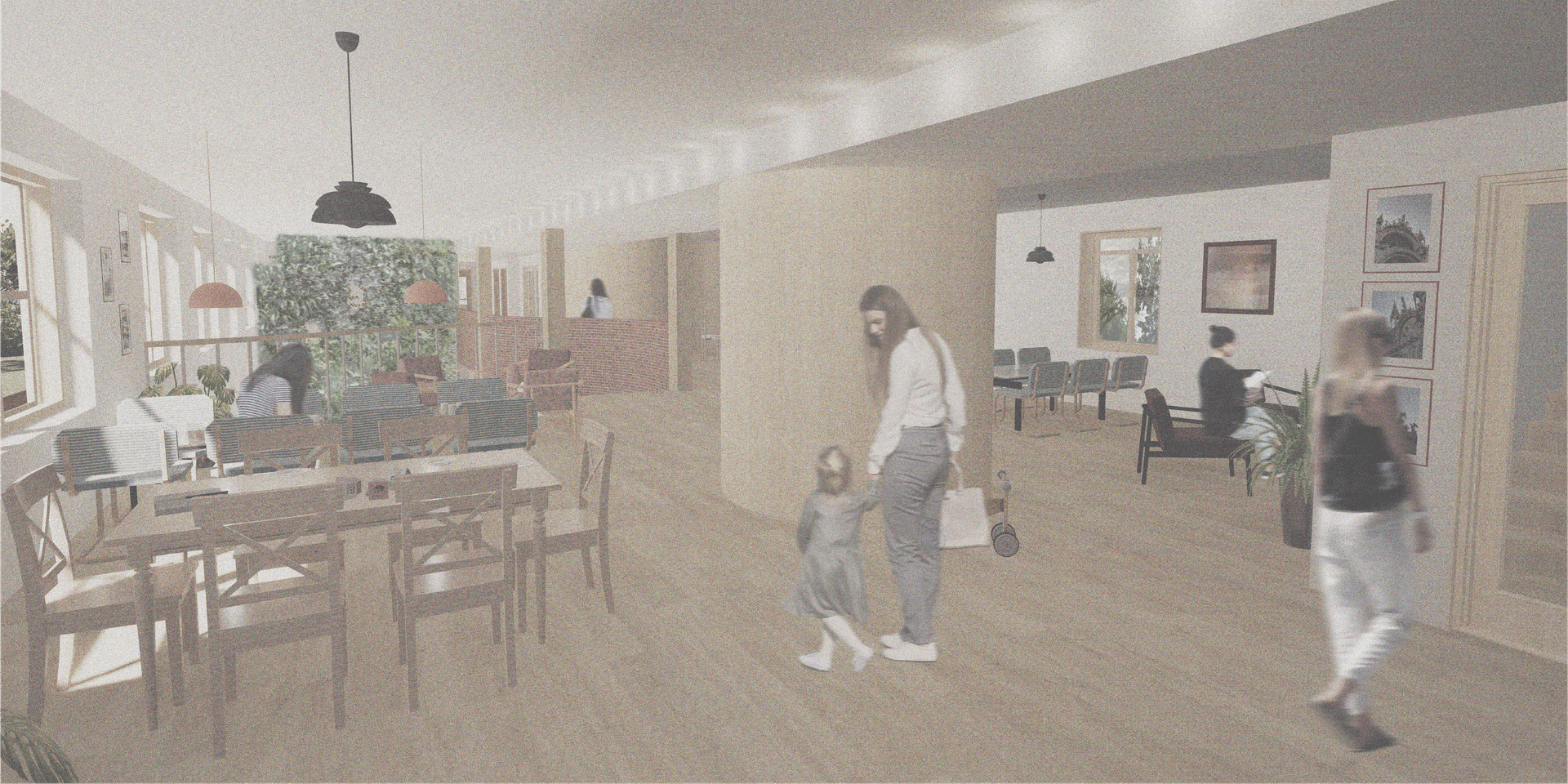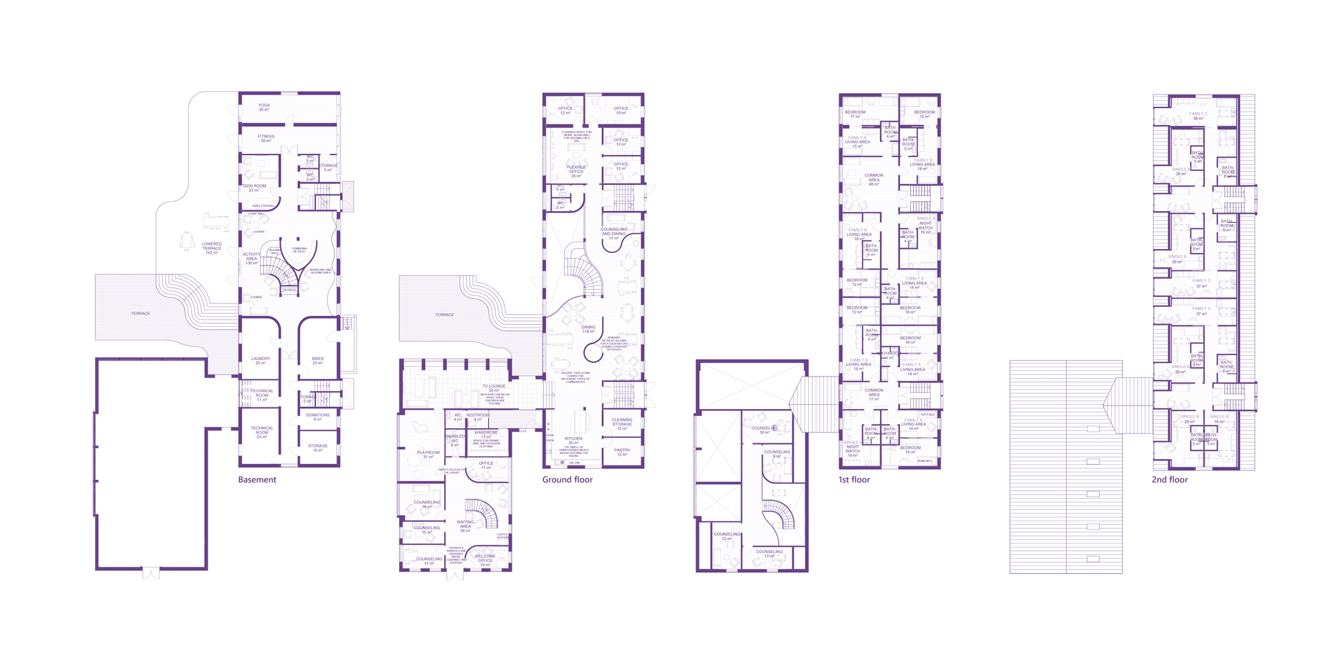 This project therefore focuses on the transformation of an old dormitory into a modern women’s crisis shelter that contributes to a faster and steady healing process through the work with social sustainability, design tools of healing architecture as well as creating an increased sense of perceived safety. The project is a proposal for a way of preserving much of a larger existing building with different user needs while at the same time de-institutionalizing the typology in order to generate a feeling of hominess. It also proposes that the presence of the institution and the activity from ambulant counseling and workplace facilities for the staff will increase the perceived safety.